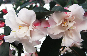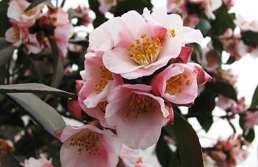 花粉白色,花瓣基部具深粉紅色條紋,單瓣,小花型,平均花徑2.79cm,花瓣5枚。多枚花蕾頂生或腋生,開花極其繁密。花期2月下旬-4月,長達40天左右。嫩葉紫紅色,成熟葉片濃綠色。立性,稍開展,常綠。