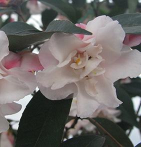 灌木,開張。芽紫紅色,簇生,嫩枝黃褐色,葉稠密,互生,近十字狀排列,水平或稍下垂,披針形,長6.5~7.5cm ,寬3~3.5cm ,橫截面平坦,細(xì)齒緣,葉基楔形,葉尖漸尖,葉脈中等,葉厚度中等,葉面光澤弱,葉背無毛,葉柄短,成熟葉片綠色或深綠色,嫩葉紅褐色;花芽頂生或腋生,萼片覆瓦狀排列,卵形,褐色,花小,半重瓣,花瓣頂端微凹,邊緣全緣,花瓣卵形,花瓣9~11枚,花徑2.5~3.5cm,外輪花瓣粉色,內(nèi)輪花瓣淡粉色或近白色,雄蕊少量,茶梅形,基部離生,部分瓣化,柱頭3淺裂,雌蕊高于雄蕊,子房無毛,花期早,上海地區(qū)2月中下旬~4月上旬。